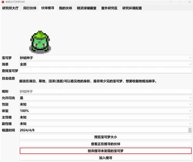 搜寻列表中未收服的宝可梦将在电脑时间 7 天后消失,如果是尚未出现的宝可梦,可以直接点击下列的放弃搜寻未发现的宝可梦。